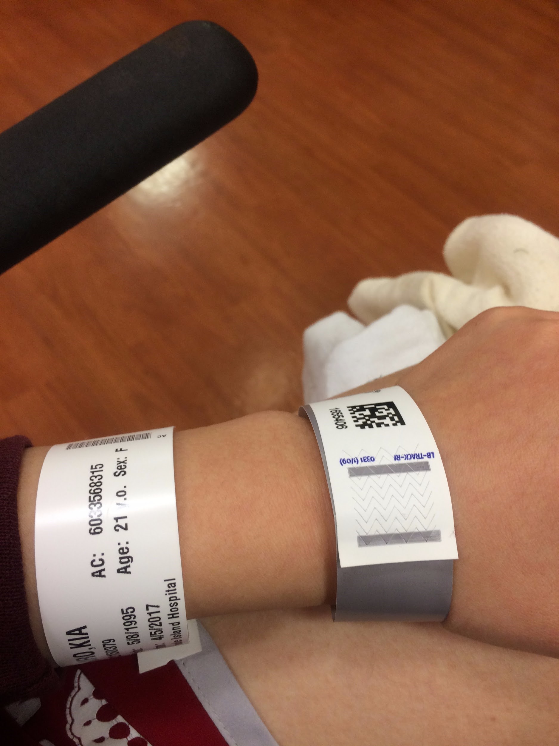 車いすに座らされ、手首に何やらつけられて、待合室に連れていかれました。