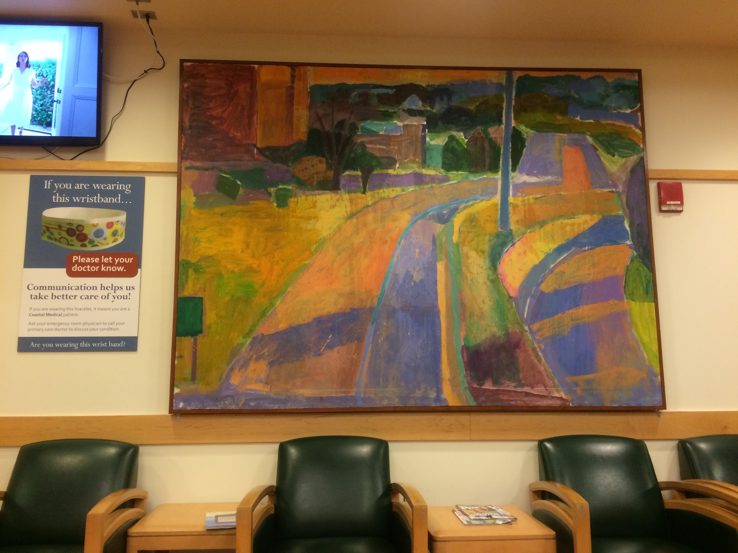 目の前に幼稚園児数名が手がけたような絵画が壁にかかっていたのでそれを眺めることに。なんとも色づかいが不吉で、不思議と心がどんよりしてきます。ついでにテレビは殺人のサスペンスドラマが流れています。
